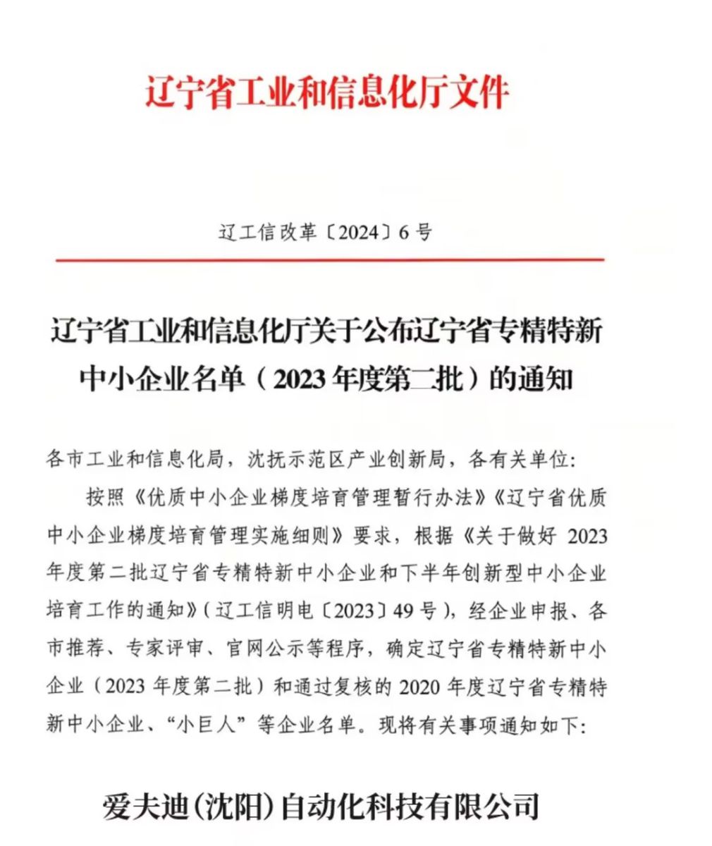 日前,遼寧省工業(yè)和信息化廳對(duì)遼寧省專精特新中小企業(yè)名單進(jìn)行了公示,愛夫迪(沈陽)自動(dòng)化科技有限公司(以下簡(jiǎn)稱“愛夫迪沈陽”)經(jīng)過沈陽市工信局初審?fù)扑]并經(jīng)專家組評(píng)審等程序后,正式通過了認(rèn)定工作,并榮獲2023年度“遼寧省專精特新中小企業(yè)”稱號(hào)。