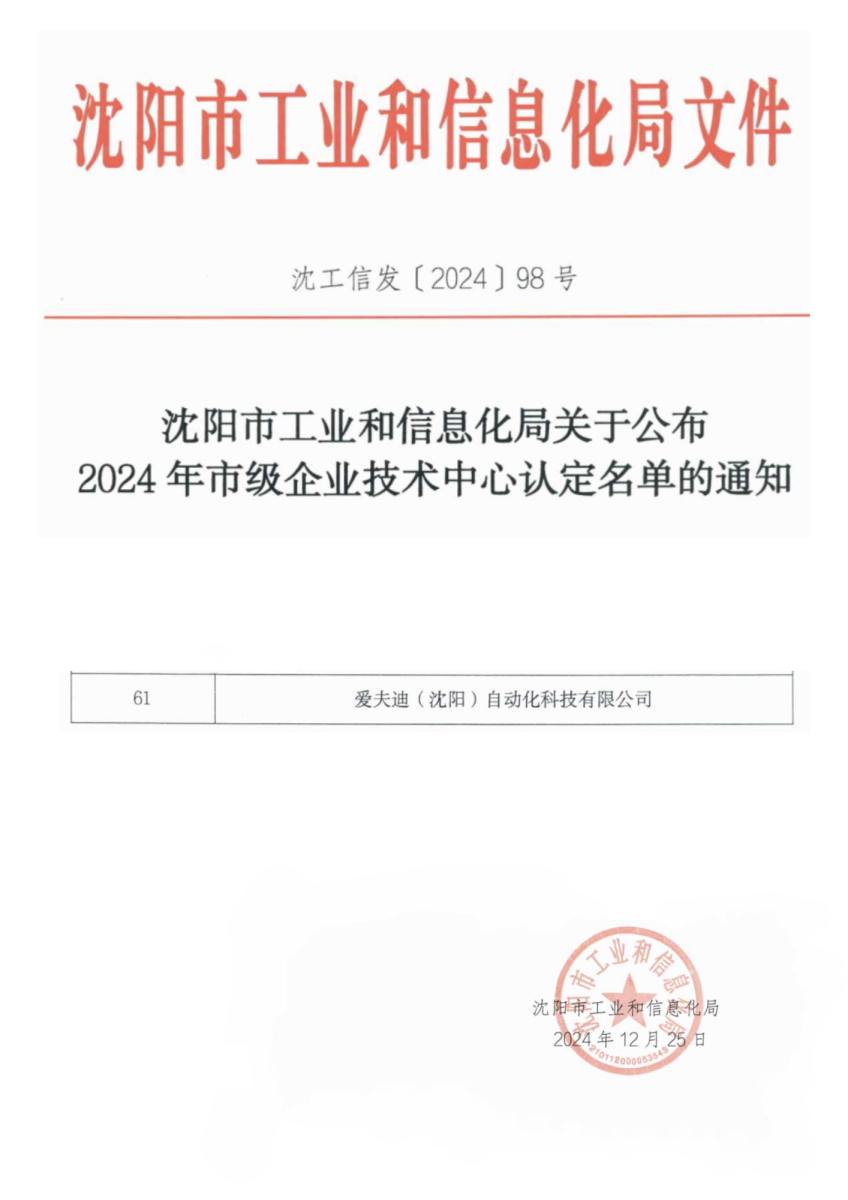 近日,沈陽市工業和信息化局公布了2024年市級企業技術中心的認定結果,愛夫迪(沈陽)自動化科技有限公司(以下簡稱“愛夫迪沈陽”)成功獲得“沈陽市級企業技術中心”的稱號。此次獲評市級企業技術中心,是愛夫迪沈陽繼榮獲高新技術企業、專精特新中小企業稱號后的又一重要里程碑,標志著公司在工業自動化領域的創新能力和發展潛力得到了廣泛認可。