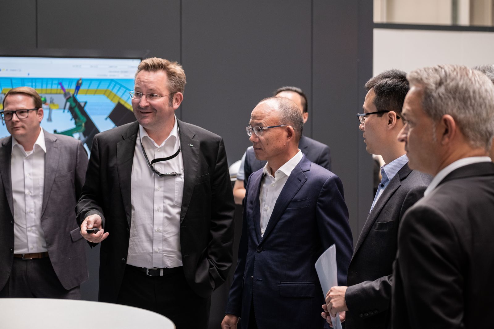 2022年7月19日,復星國際董事長郭廣昌一行于德國訪問期間參觀考察了翌耀科技旗下企業FFT Produktionssysteme GmbH & Co. KG(下簡稱FFT),并為FFT位于富爾達的展廳揭幕。FFT 首席執行官Tristan Pfurr陪同郭廣昌一行參觀了全新落成的展廳,向大家展示了各種機器人的交互合作,以及FFT的專有技術和相關應用領域。